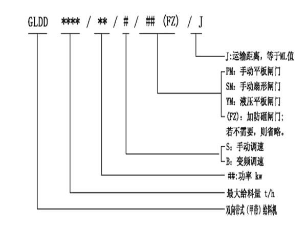 雙向帶式(甲帶)給料機(jī)型號(hào)說(shuō)明: