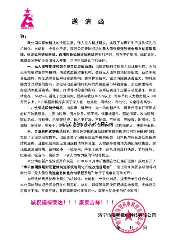 我公司應(yīng)煤炭科技的快速發(fā)展,強(qiáng)力投入科技研發(fā),實(shí)現(xiàn)了為煤礦生產(chǎn)提供領(lǐng)先的機(jī)械化、自動(dòng)化、專業(yè)化產(chǎn)品,現(xiàn)我公司研制成功的無人值守旋連膠鏈全息自動(dòng)裝載系統(tǒng)、快裝式膠鏈給料機(jī)、自清料輪式鏈板給料機(jī)等專利產(chǎn)品,已在棗礦集團(tuán)、臨礦集團(tuán)、鄭煤集團(tuán)等礦業(yè)集團(tuán)投入使用,并得到高度認(rèn)可和好評(píng)。